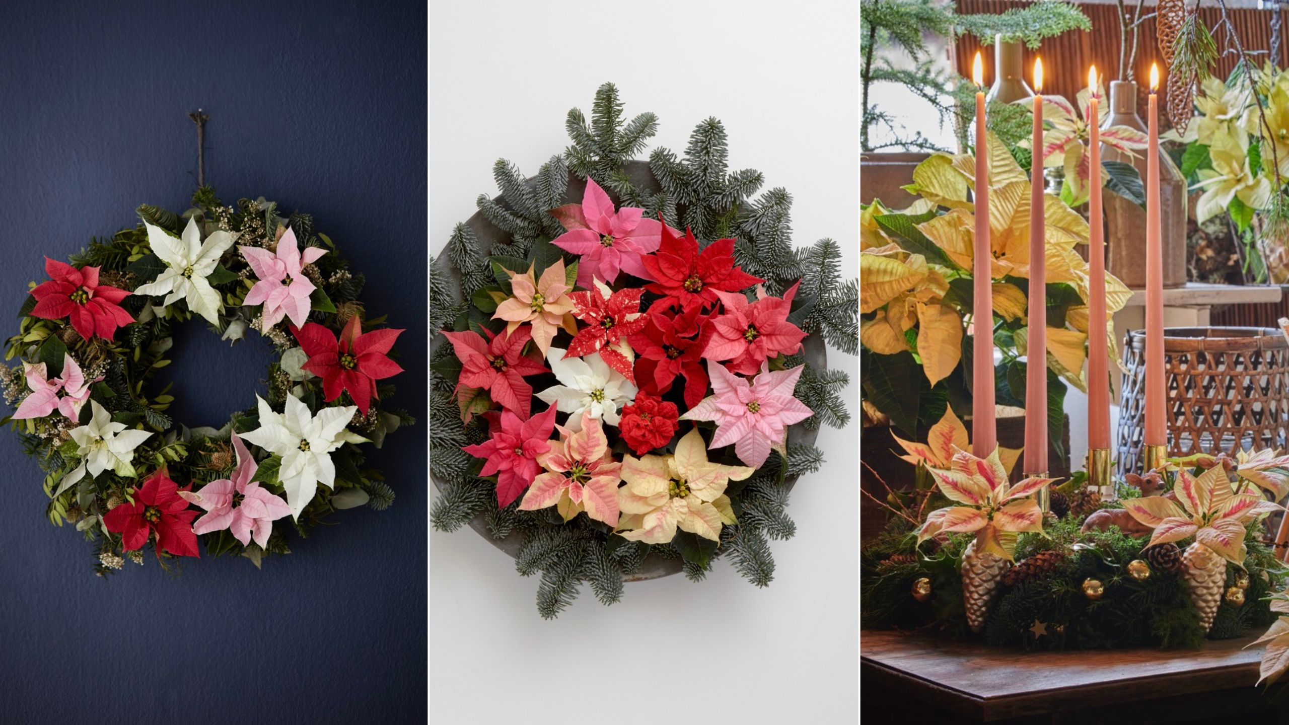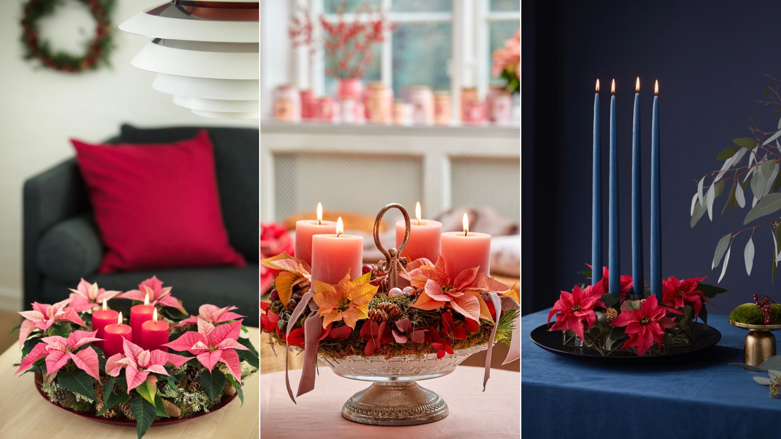 Joulun kukissa ei tarvitse tyytyä vain perinteisiin punaisiin, vaan sävyjä löytyy persikasta keltaiseen. Eriväriset joulutähdet muodostavat keskenään harmonisen kokonaisuuden seinälle tai pöydälle.