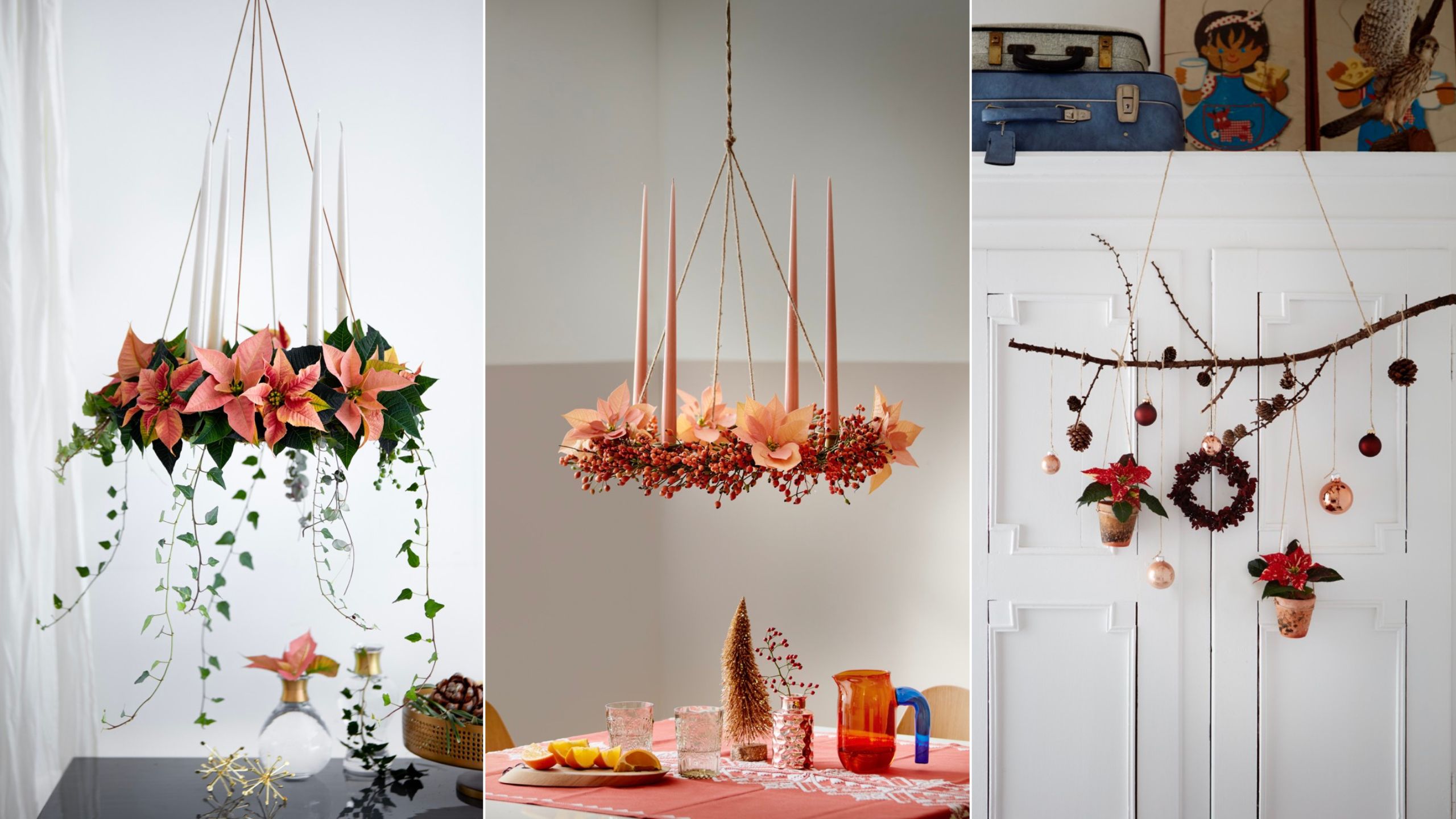 Kranssi toimii tunnelman nostattajana myös ripustettuna. Kattoon kiinnitetty kranssi on ihanan ilmava vaihtoehto varsinkin sellaiseen kotiin, jossa pöytätilaa on niukasti.